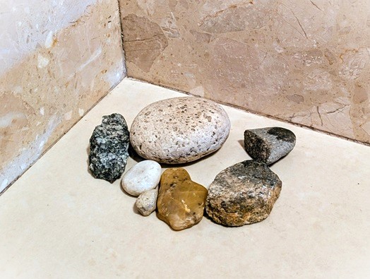 近所で子どもが拾ってきて、「はい、ママ、おみやげだよ」と言ってくれた石が、7個、ずっと玄関に置いてあります。